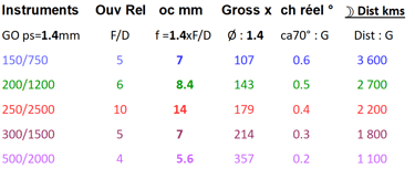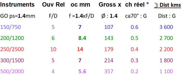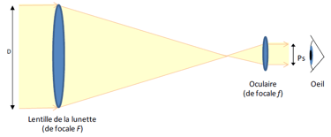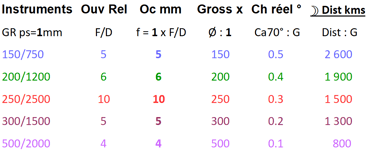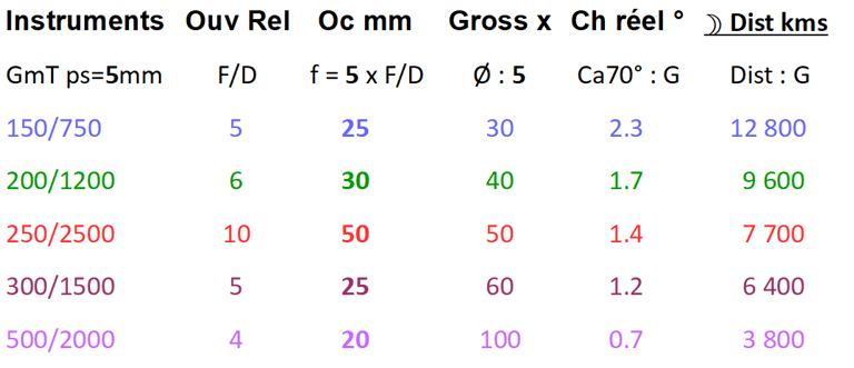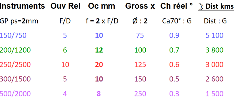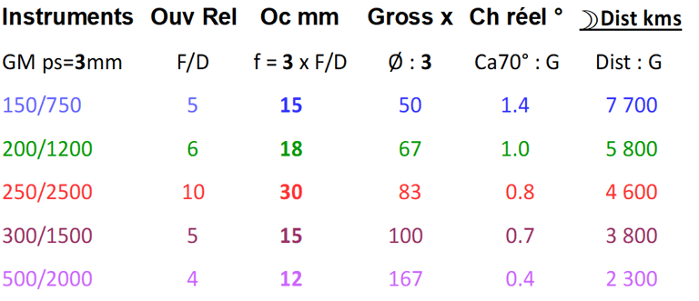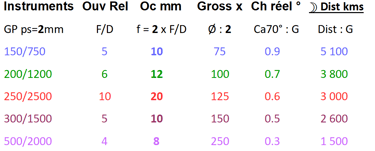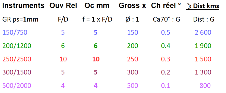 Par ex, un instrument de 80/400 F/D5 et un autre de 200/1000 F/D5, avec un même oculaire de 10 mm donneront tous les deux la même Ps égale à 2 mm. Toutefois, le 200mm restera l’instrument le plus lumineux.
